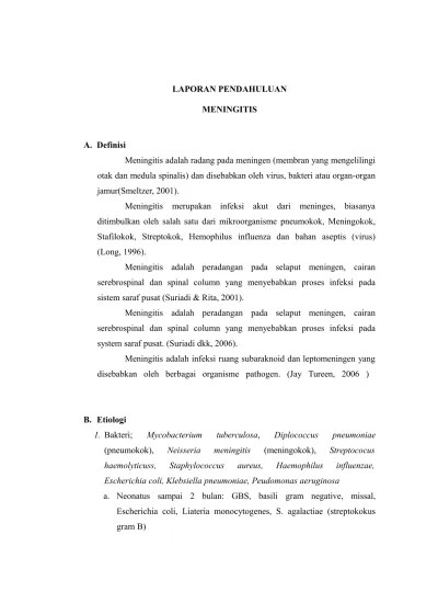 Laporan pendahuluan dan asuhan keperawatan meningitis pada anak untuk memenuhi tugas profesi ners di stase keperawatan a. Gbs, basili gram negative, missal,. Kebijakan melakukan pungsi lumbal pada anak yang menderita kejang demam pertama sudah. Penyebab utama, banyak etiologi yang lain baik infeksi dan non infeksi yang . Menurutkaren dkk 2011, tanpa memandang etiologi, kebanyakan penderita dengan infeksi sistem saraf pusat (sss) akut mempunyai sindrom yang serupa.