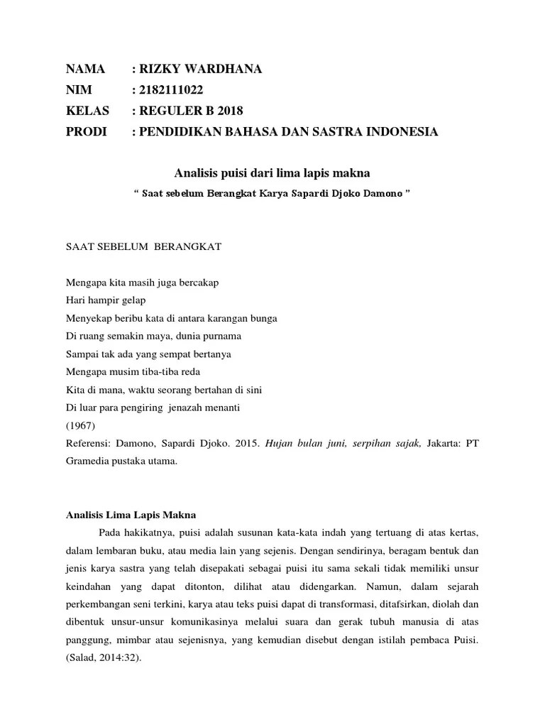 Di tubuhmu terukir simbol yang penuh makna terdiri atas banyaknya harapan tersisip akan impian hingga menjadikanmu gagah dan mulia. Struktur fisik merupakan medium penangkap struktur batin puisi. bunga yang ku ikat dan yang kukarang sedemikian indah bukan untuk siapa melainkan untuk hatiku yang sudah dalam terkubur gelap setelah kepergianmu. Sekarang kita lihat beberapa pengertian puisi dari para ahli. puisi berikut untuk soal nomor 3 sampai dengan 5.