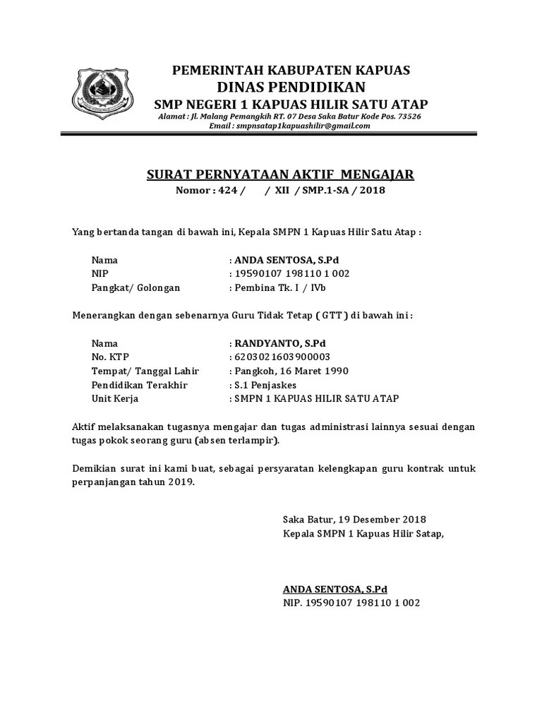 Contoh surat lamaran kerja guru honorer yang masih kuliah kepala . Contoh surat keterangan aktif mengajar guru pns non pns sd negeri. Nama tersebut adalah benar sebagai tenaga edukatif / guru pada smp pp yang kami pimpin, terhitung sejak 12 juni 1987 dan masih aktif sampai dengan sekarang. Brebes, 24 mei 2016 kepala sekolah. Digunakan sebagai bukti bahwa seorang guru atau kepala sekolah aktif .